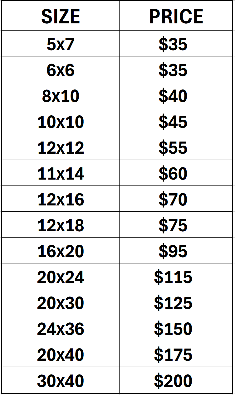 ALL SIZES IN INCHES - MORE SIZES AVAILABLE UPON REQUEST